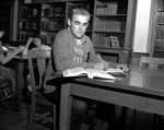 Bobby Jack Oliver, Abilene's all district tackle, gets in some library time. He shines in the classroom as well as on the gridiron, carrying a "B" average. A young man wearing a sweater sitting down reading an open book.