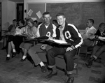Quarterback Carl Schlemeyer (left) and Right End Sonny McLaughlin, not only are the state's leading pass-and-catch team, but they also shine in the classroom. Carl's a solid "B" student, Sonny has a 94 scholastic average. A classroom filled with students sitting in their desk, two football players are facing the camera only. The one on the right is smiling and the one on the left has a neutral expression on his face.