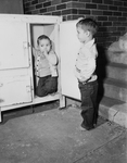 Johnny Brown, left, and big brother Vernon, locks are removed after near tragedy. Johnny is shown kneeling inside of a metal box, with its doors open. Vernon is shown standing in front of the box, holding the door open. Johnny and Vernon are both toddlers.