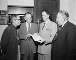 A check for $434.08, proceeds of a barbershop quartet benefit program at TCU, is presented to Judge Fisher T. Denny, second from left, to be used for the Tarrant County Children's Home. Making the presentation are S. R. Billingsley, second from right, president of the Fort Worth chapter, SPEBSQSA, and George Garnett, right, finance chairman. Hugh Inman, superintendent of the home, is at left.