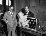 Smoke rises from a demonstration board after A. J. Fogaley, left, inserted a penny behind a burned out fuse. Mason Lankford, president of the Tarrant County Volunteer Fire Fighters Association, will aid Fogaley in a fire prevention course for volunteer firemen in the county.