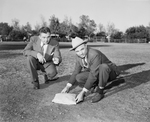 Bob Loughridge, left, president of the Optimist Club, helps Charles W. Hilburn, boys work chairman, line up the bases at a South Side playground. The club is sponsoring a program which interests 240 boys in sports and character building projects.