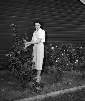 Mrs. Arnold H. Egly, new president of the Junior Woman's Garden Club, clips some roses for a bouquet at home, 1120 N. Sylvania. She was installed at a luncheon recently at River Crest County Club. Published in Fort Worth Star-Telegram evening edition May 8, 1950.
