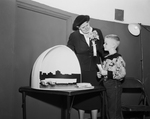 Sandy Jones, son of Mr. and Mrs. John Wesley Jones, 1708 Sunset Terrace, hears Miss Charlie May Noble describe the work of the planetarium at the Fort Worth Children's Museum. Sandy's father made the small-scale furniture to show how the room would be furnished when completed. Sandy and Miss Noble are looking at a miniature display of the planetarium.