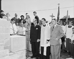 All Saints Episcopal Church concludes its building program at cornerstone laying ceremonies at the sanctuary. Taking part in the program were, left to right, C. H. and J. H. Delwaide, masons, Ray F. Holmes, building fund chairman, Reverend James P. DeWolfe Junior, rector, and Harold S. Gish, junior warden of the parish. Standing behind and around them are men, women, and children.