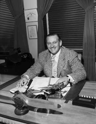 This informal picture of Charles T. Freelove shows the architect dreaming of aviation as he sits at his desk in his Fort Worth office. Flight charts, slide rules and architectural plans occupy all his waking hours.