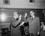 Jack E. Burton, North Side electrical contractor, was sworn in as a member of the City Council, replacing Thomas A. McCann. City Secretary E. S. Birdsong, left, administers the oath of office. Both men are shown standing and holding up their right hand.