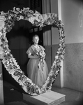 Miss Cora Posey, sweetheart of Eastern Star of Texas. Miss Posey is shown wearing a gown, and holding a bouquet of flowers. In front of her is a large arrangement, made of ruffled fabric and leaves, in the shape of a heart, framing her.
