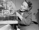 Two patients in this picture are Peta, the parakeet, and Mrs. Roy Kline of 3809 Biddison. Mrs. Kline is in Saint Joseph's Hospital recovering from a broken left leg and right foot. Peta succumbed to loneliness, and didn't quit drooping until taken to Mrs. Kline's hospital room. The parakeet is shown in a birdcage, and Mrs. Kline is shown comforting the bird.