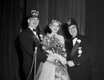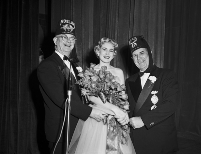Yvonne Bevil, blond, blue-eyed 21 year-old daughter of Mr. and Mrs. J. D. Bevil of 3315 West 7th, was congratulated by Shrinedom's Imperial Potentate Remmie L. Arnold of Petersburg, Virginia, right, at Will Rogers Memorial Auditorium on her selection as Tarrant County princess for the Shrine Circus here November 20-29, 1953. The man at left is unidentified.