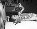 Jerry Bynum, son of Mr. and Mrs. E. T. Bynum, 8225 Carlos, was honor guest at W. I. Cook Memorial Hospital Center for Children. All patients able to attend the party celebrating Jerry's seventh birthday sang songs and entertained him. The youngster has tuberculosis of the spine and has been a patient at Cook since August 4, 1953. Jerry is shown lying on his back, and playing with a stuffed toy. Jerry is wearing a support brace on his head.