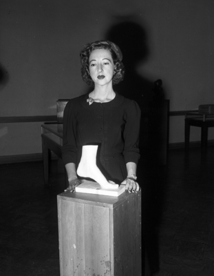Electra Waggoner Biggs, member of a Texas pioneer family, is in Fort Worth to exhibit her sculpture at the Public Library under sponsorship of the Fort Worth Art Association. Biggs. an artist, sculptor, ranch heiress was the daughter of Edward Paul Waggoner and an heiress of the Waggoner Ranch. She is shown with one of the items in the exhibition.