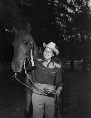 Edna Porter Brown, 13, of Haltom Farm, and Sue, winners in the stock saddle class for riders under 14 years of age. Published in the Fort Worth Star-Telegram morning edition, May 7, 1950.