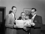Pictured here is Dean T. Smith McCorkle of TCU's School of Fine Arts, center, looking over music of the state song, "Texas, Our Texas," with Dr. Ralph Guenther, left, and Lewis Gillis, right.