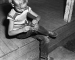 Unidentified child with worn out pants. He is sewing his own pants.