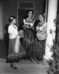 Three women who will participate in the "South of the Border" fiesta to be presented by the Pan American Round Table at Pioneer Palace are pictured in the costumes they will wear. Left to right are Mmes. Tim Paulsell, Lon A. Martin and Mary Ellen Ferguson.