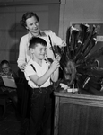 Mrs. Lou. Caceres, a second grade teacher at Bluebonnet Elementary School, helps Douglas McMahan, 7, one of her students, place a feather in a cut-out turkey in their classroom, signifying a contribution the boy made to PTA work. Douglas is the son of Dr. and Mrs. George McMahan, 3600 Dryden Rd.