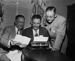 Roy Naugle, left, president of Fort Worth's Downtown Lions Club; J. Harrold Evans, center, president of Arlington Heights Lions Club, and G. H. (Smiley) Norman, president of North Side Lions, prepare a petition asking that next district convention be held in Fort Worth.