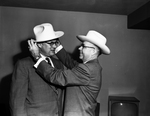 Carl Jehlen of Springfield N. J. President of the Club Managers Association of America, was given a Texas hat soon after his arrival at Fort Worth on a national tour. Page Curran, manager of River Crest Country Club, adjusts the hat for Jehlen.