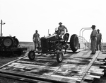 The first carloads of farm equipment for the Texas Ranch and Farm Show. Ed Broach, service manager for Masey Harris in Dallas, drives a tractor down the ramp, John Swanner gives directions. Massey Harris Company brought in three carloads for the show.