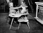 John Young, 4, pours tea for sister, Carol, 3, while trying Indian Type toy furniture a department store executive bought in Taos, while on vacation. John and Carol are children of Mr. and Mrs. Murdock E. Young.
