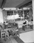 Old things have helped make this newly purchased home of Mr. and Mrs. William S. Moore at 2255 Roberts Cutoff Road. Mrs. Moore with her dog, "Old Folks", is shown in the 20 by 36-foot living room. A table 100 years old is in the foreground. Through the picture window is a view of Lake Worth.