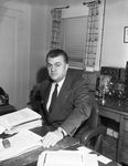 Pictured here is E. W. Dunbar seen here in a suit at a desk positioned for a bust shot
