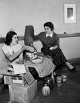 Mrs. Dorothy Bousman, left, Fort Worth Art Association secretary and Mrs. Joyce Shrake are shown unpacking some of the items for the Christmas show which opens in the Public Library gallery. Hundreds of art objects by Texas artists will be available for Yuletide shoppers.