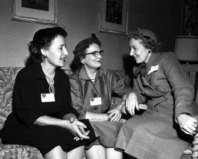 Three "Young Men's Christian Association (YMCA)" leaders who are participating in a Southwest regional conference are, left to right, Mrs. Eugene Sparling of Hot Springs, Arkansas, a YMCA national board member; Mrs. J. M. Wilson, president of the Fort Worth YMCA, and Mrs. Savilla Simons of New York City, general secretary of the national board.