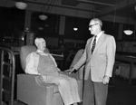 J. L. (Red) William tries out the chair presented to him on his retirement from employment at the Fort Worth Post office as Postmaster Jernigan thanks him for 26 and a half years' service with the Post office Department.