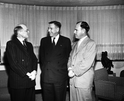 Aviation leaders from throughout the nation gathered at Amon Carter for a dinner session. Left to right, are H. Neil Mallon of Dallas, president of the council for World Affairs; C. E. Woolman of Atlanta, Georgia, president of Delta-C&S Airlines, and Amon Carter Jr.