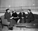 Some of the guests at a special dinner at Carter Field for aviation leaders relax and talk shop. From left to right, are Major General William D. Old, commander of Sheppard Air Force Base Wichita Falls; Major T. Hurley; Hurley, chairman and president of Curtiss-Wright Corporation, Wood-Ridge, N. J. and Frederick C. Durant III of Washington president of the American Rocket Society.