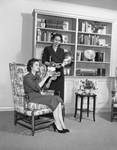Mrs. O. Paul Leonard Jr. sitting on lounge chair and Mrs. Robert W. Leonard standing beside the chair are posing in front of bookshelf. They are holding candles customized for Christmas celebration.