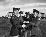 Brigadier General Edward G. Farrand, assistant commander of the 1st Armored at Fort Hood, presents a Distinguished Air Force Reserve Officers' Training Corps (ROTC) Student Award to Marshall T. (Boogie) Robinson, Texas Christian University football player, at a review. Left to right, General Farrand, Lieutenant Colonel G. R. Davis of Texas Christian University, Lieutenant Colonel John W. Murray of Texas Christian University, and Robinson.