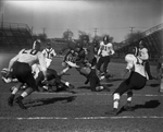 Colt Halfback Buzz Kemble's three-yard gainer is put to an abrupt halt by Center Joe Williams of Texas Christian University (TCU) after the former Arlington Heights player had moved the ball to the Winning Frog four in Frogs-Colt Freshman game at Dallas. Southern Methodist scored on next play but Texas Christian University won game, 27-13.