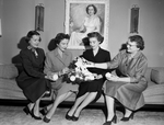 Left to right are, Mmes. T. B. Romine Jr., E. Claude Manning Jr., Kleber Miller and J. H. Wilson sitting on a sofa with a Christmas decorating showpiece in their hands.