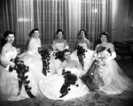 In a formal setting in the Crystal ballroom at the Hotel Texas, six girls were presented by the Beth-El Sisterhood at its annual Thanksgiving charity ball. The girls are, left to right, Misses Alix Robinson, Marylin Shanblum, Frieda Weisblatt, Marlene Dworkin, Sandra Schuster, Estaline Tuck