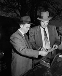 Fort Worth Detective Captain R. E. Pinckard, right, and Ray Carr of the department identification bureau check out fingerprints to make sure the shot near Sanger was Henry Perry Denson. The prints matched and the police marked the case closed.