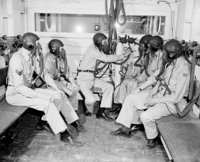 Lieutenant Sam J. Lockett, center, adjusts an oxygen flow regulator during an indoctrination "flight" to 45,0000 feet in the Carswell Air Force Base altitude chamber. B-36 crew members take the course to learn how to survive aloft, where 45,000 feet a man without oxygen will die within 12 to 20 seconds.