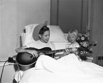 Though he suffers from hemophilia-dread bleeding disease, youthful hillbilly performer Curtis Goodman, 14, keeps up spirits at W. I. Cook Memorial Hospital Center for children. Getting a few points from Curtis on guitar playing is 5-year-old Sandra Allen, daughter of Mr. and Mrs. Lee ray of 2920 Travis.