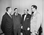 Trade unionism talk had an international accent at a dinner honoring Leonard Wright, London secretary of the National Union of General and Municipal Workers. Left to right are Ted Morrow of Dallas, commissioner of the Federal Mediation and Conciliation Service, Wright; Lester Graham, regional director for the American Federation of Labor, and L. Ross Mathews, secretary-treasurer of the International Association of Machinists Lodge 776.