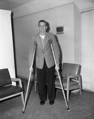 Bill Sousae standing with the support of his crutches in front of sofa chairs.