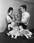 Janice Blair, daughter of Mr. and Mrs. Jack B. Blair of 2841 Avenue K, a member of the Girl Scouts who are repairing and dressing the dolls being collected by the panther Boys club, turns the first finished ones over to Panther Boy Harold Chaney, son of Mrs. Gladys Chaney of 510 South Adams. The Panther Boys were collecting and repairing toys to stock the Christmas toy store of the Salvation Army.