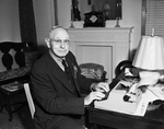W. D. Gordon, 912 South Oakland, tries out the portable typewriter given by fellow Santa Fe railway employees when he retired.