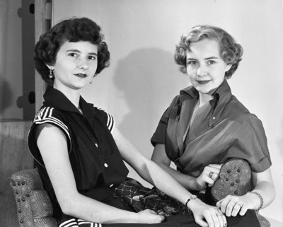 Joan Loesewitz, left, 1323 South Lake, and her cousin, Ann Dyer, 1021 eighth Avenue, will leave June 5 for Los Angeles and Roy, New Mexico, for two months' vacation. Two young women sitting together. Published in Fort Worth Star-Telegram morning edition, May 28, 1950.