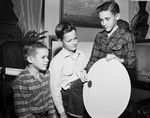 Three 11-year-old astronomy students of the Fort Worth Children's Museum practice speeches which they gave at a junior session of the Texas Academy of Sciences in Galveston. Left to right, Pat Jones of 2115 Park Plaza, Jim Hubbard of 2311 Harrison and Roger Brown of 3020 Lubbock. Roger points to a model of Jupiter in relation to the sun.