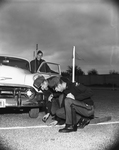 Scout Jerry Ingram watches as two traffic officers measure how near his front bumper came to finish line during a stopping test. Sergeant L. E. Wood, center, and R. C. Campbell checked scores of Scouts during a Fort Worth Safety Council rodeo.