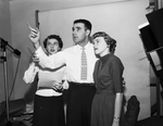 Co-Director Gloria Gathings, left, coaches Carswell Staff Sergeant Joseph Bilardi in pointing out a star to Evelyn Harrell, two of the featured players in "The Star in the Window." The play was presented in Our Lady of Victory auditorium.