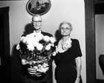 Mr. and Mrs. J. B. Miller dressed in black on their 50th wedding anniversary. Mr. J. B. Miller is holding a flower bouquet.