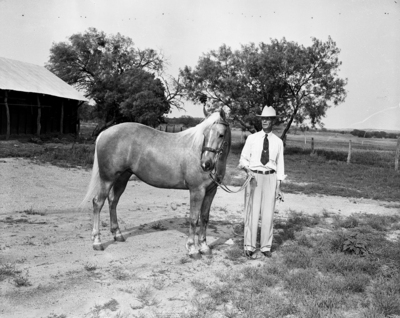 Image shows Henry C. Wilson standing with his 3 year old Palomino Quarter horse mare. The horse has been a grand champion, reserve champion and has won three blue ribbons in five showings. Published in the Fort Worth Star-Telegram morning edition, August 6, 1950.